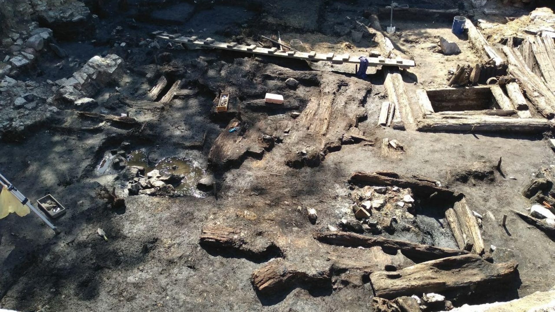Еще один опечек нашли в блоке истлевшего дерева. Печка рухнула вниз, поэтому археологи надеются, что основной массив окажется ниже и они смогут не только определить, какие изразцы и дуговые кирпичи использовались, но и восстановить общий облик.