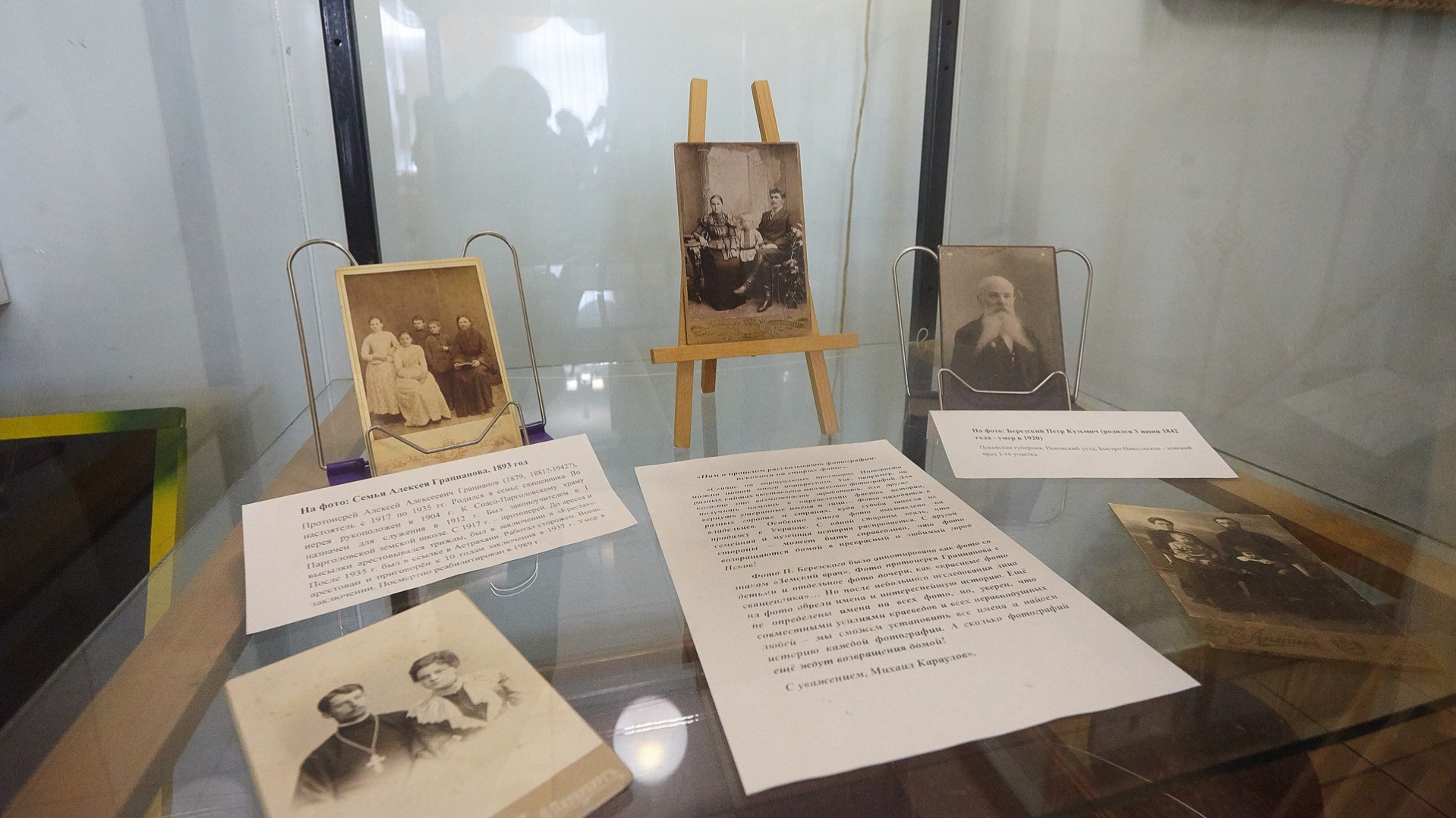 Все снято в Пскове в начале прошлого века. У Михаила Викторовича корни псковские. Он неравнодушен к Псковской земле и старается заниматься этой темой. Фотографии специально выставлены для того, чтобы опознать на них людей. На одном снимке семья Грициановых. Лица, запечатленные на других, неизвестны.