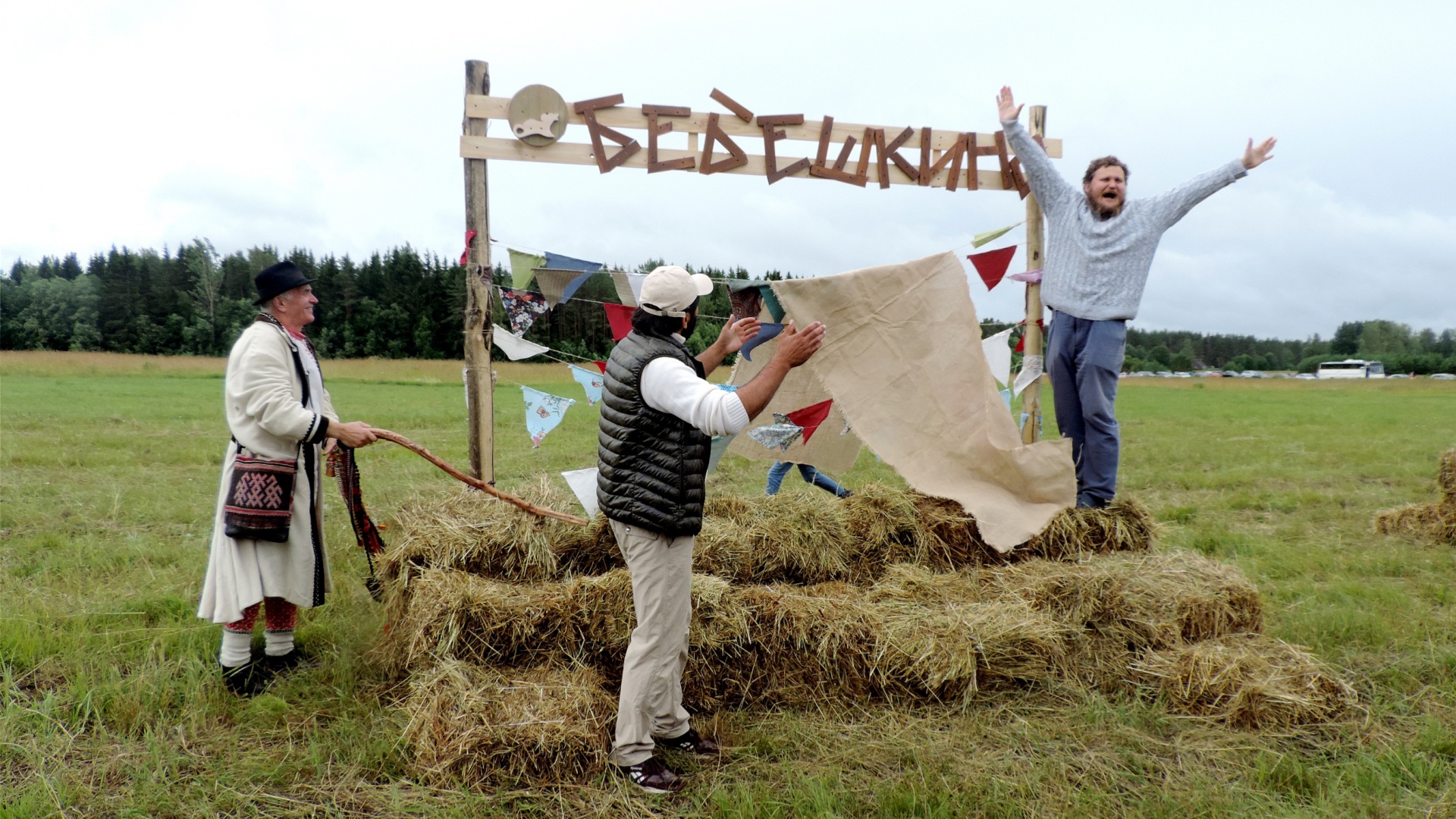 А затем прямо со сцены организаторы вместе с королем сето отправились поучаствовать в символическом открытии деревни. Под аплодисменты присутствующих они сняли полотно с вывески с названием деревни: