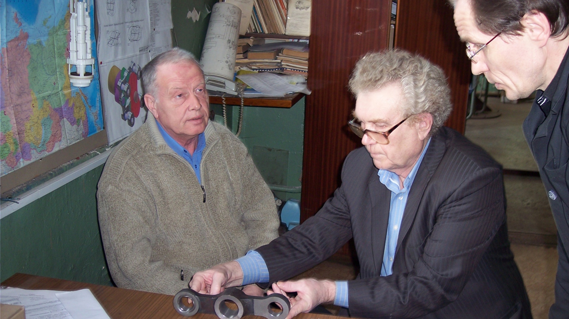 На главном фото: Конструктор Юрий Лукьянов, профессор ПсковГу Юрий Журавлёв и кандидат технаук Сергей Тихонов обсуждают детали двигателя.