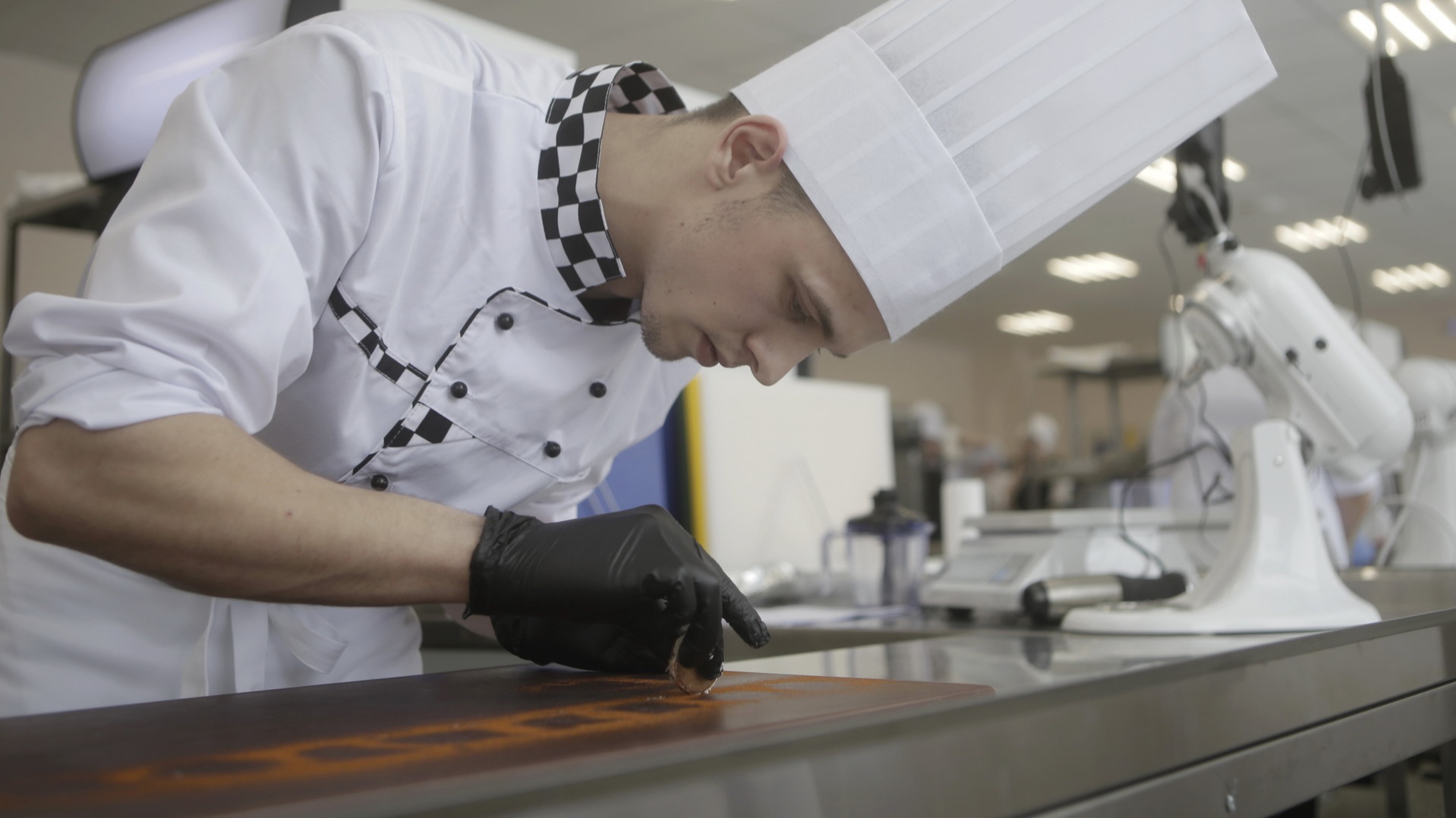 За стеклом - множество людей в белых поварских куртках и колпаках: кто-то отрабатывает навыки рисования кремом, кто-то уже украшает готовые блюда, а кто-то моет посуду и столовые приборы. Участников конкурса всего шесть – трое юношей и столько же девушек. С уборкой рабочих мест им помогают волонтеры. А люди, которые, на первый взгляд, ничего не делают, заняты самой важной работой. Это эксперты, они оценивают конкурсантов по 50 критериям!