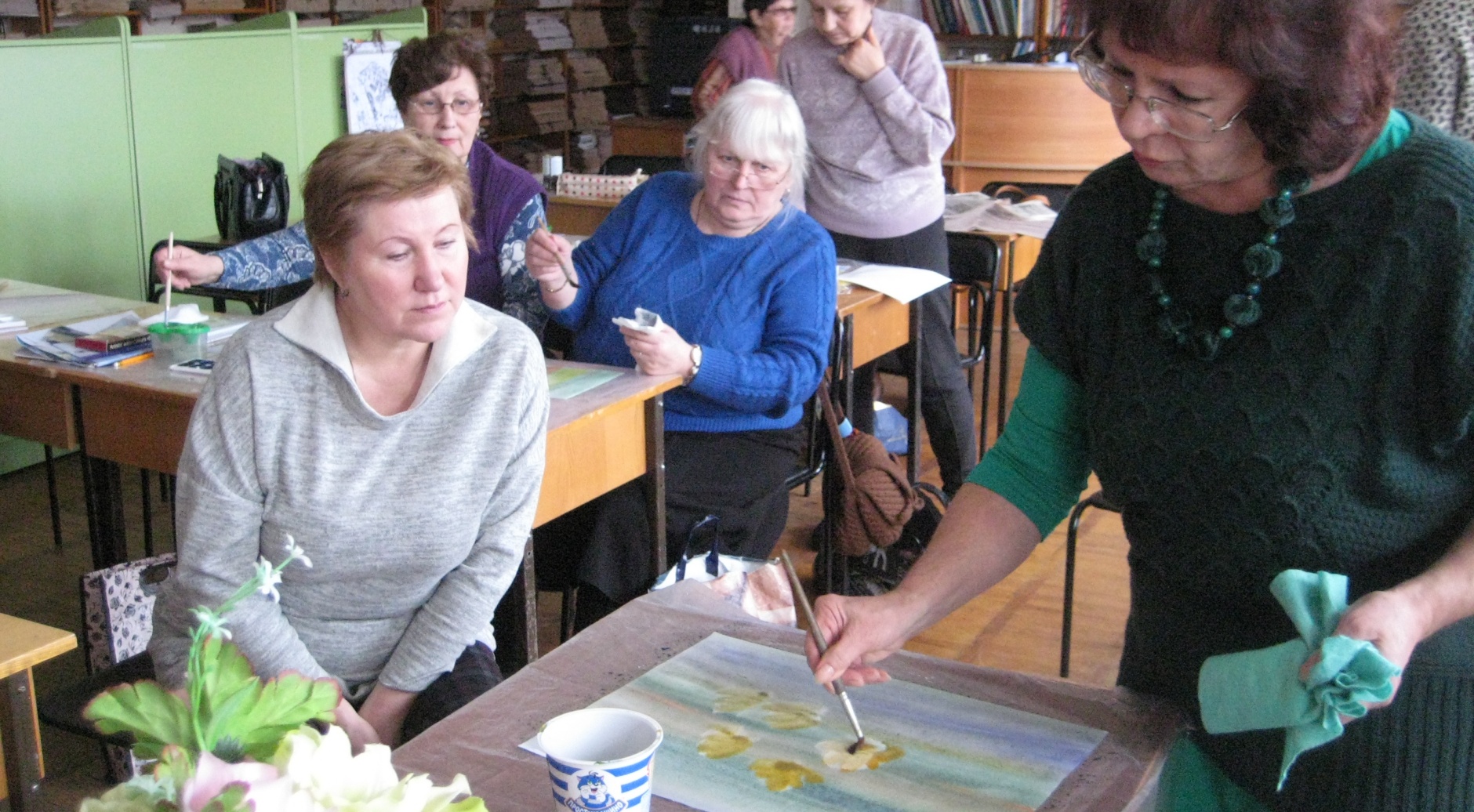 Опытные наставники помогают пенсионеркам освоить премудрости искусства.