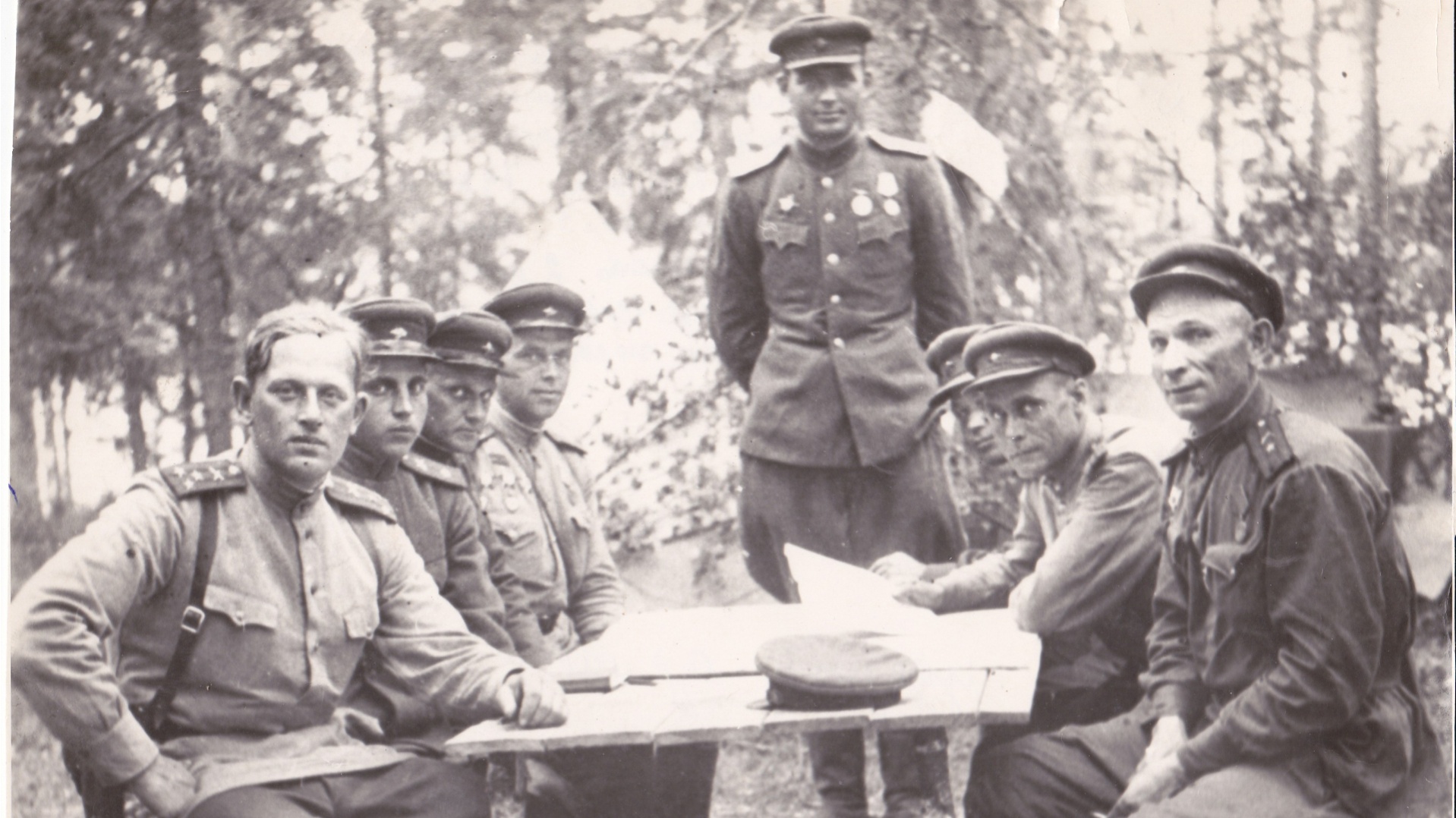 Ю. С. Янкевич (первый ряд, справа) — бывший партизан и фронтовой разведчик, с боевыми товарищами. После войны возглавлял сельскохозяйственные организации Новосокольнического района, был делегатом XXII съезда КПСС.