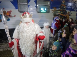 Поезд Деда Мороза прибыл на псковский вокзал утром 30 декабря. В 12 тематических вагонах приехали Дед Мороз из Великого Устюга, Снегурочка из Костромы и их помощники.