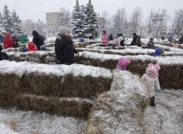 В честь Масленицы в сквере на Четырех углах в Пскове построили для детей лабиринт из сена и большие соломенные фигуры.