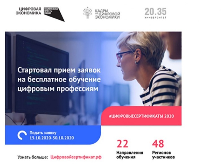 Жители Псковской области могут получить персональный цифровой сертификат на бесплатное обучение компетенциями цифровой экономики. Для этого необходимо до 30 октября подать заявку https://цифровойсертификат.рф, сообщили «Псковской правде» в пресс-службе администрации региона.