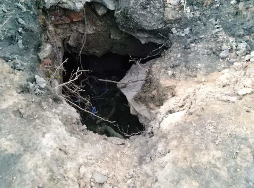 «Провал сантиметров 50. На этом участке нет освещения. Провалиться ногой в эту яму вполне реально, а ребёнок и вовсе уйдёт по пояс», - отметили очевидцы.