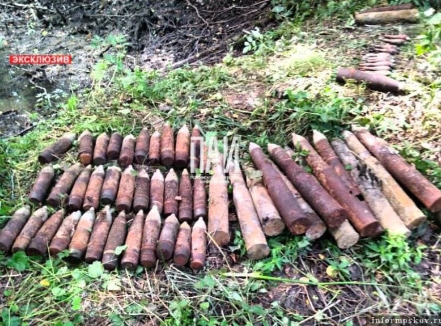 Шестьдесят артиллерийских снарядов и минометных мин времен Великой Отечественной войны нашли в Великолукском районе, у мемориала «Птахинская высота».