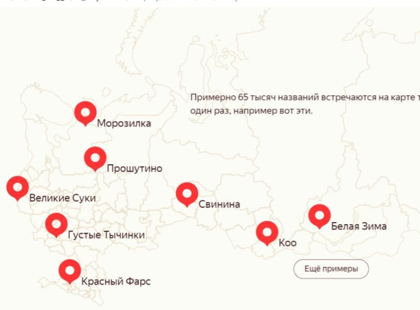 Кроме того, в процессе изучения названий населённых пунктов аналитики заметили, что некоторые из них образуют интересные пары и объединили их в маршруты на «Яндекс. Картах». Так, псковские Опухлики связали с Пивковым в Тверской области, Лютые Болота - с Теплынькой в Новгородской области, Дно — с Успехом в Башкортостане, Мду — с населённым пунктом Ура в Ярославской области.