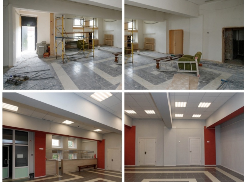 Приведены в порядок входная группа (крыльцо навес, площадка), фойе, хореографический зал, оборудован гардероб для посетителей, частично заменены окна. В одном из отремонтированных помещений разместится волонтерский центр, он начнет работу в середине сентября. Также в здании ДК заменили систему канализации и отремонтировали санузлы, которые раньше не работали. Рабочие обновили и проход к концертному залу — перекрасили стены, заменили двери, установили подвесные потолки.Заведующая ДК Ирина Фомина отметила, что ремонт стартовал в конце мая, и сейчас учреждение колоссально преобразилось. «Над входом появился козырек, а на лестнице уложена отделочная плитка и заменены перила. В фойе выполнен косметический ремонт. Также там появилась гардеробная зона. Раньше все оставляли верхнюю одежду или на сиденьях прямо в фойе. Конечно же, это создавало неудобства. Теперь проблема решена», - рассказала она.