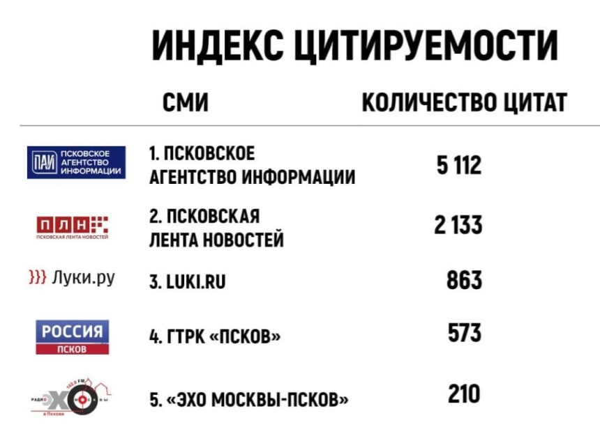 Самым цитируемом псковским СМИ в сентябре было Псковское агентство информации — ИЦ 21,32. Материалы информагентства другие СМИ использовали 5 тыс. 112 раз.
