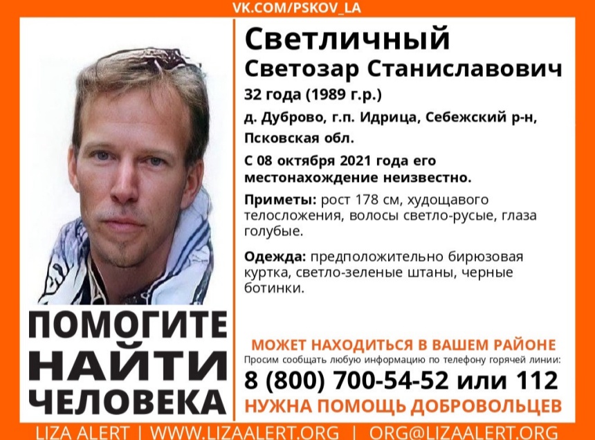 Разыскивается 32-летний Светличный Светозар Станиславович, сообщили в группе поискового отряда «Лиза Алерт» Псковской области.