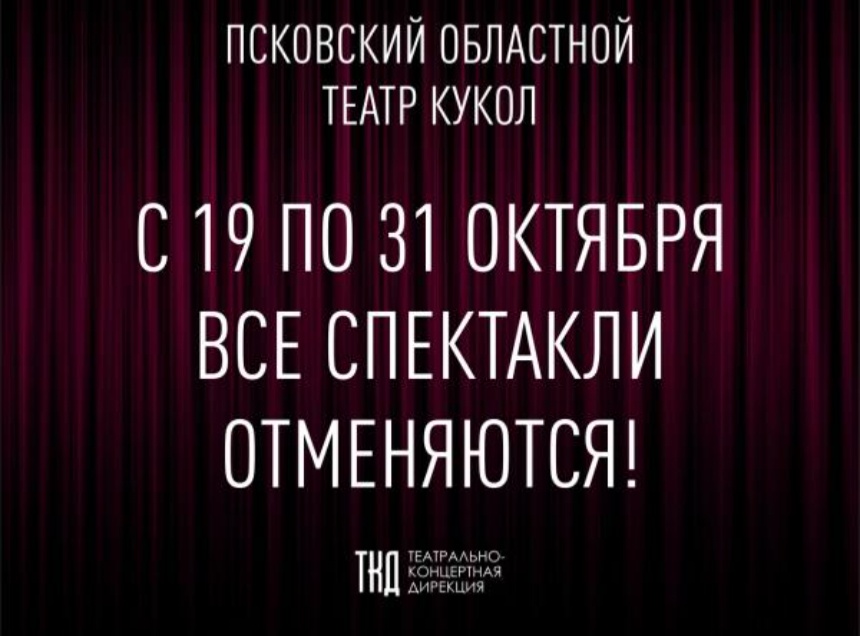 Все спектакли в Псковском областном театре кукол отменяются с 19 по 31 октября в связи с болезнью технического специалиста, отвечающего за сопровождение спектаклей. Об этом «Псковской правде» сообщили в пресс-службе Театрально-концертной дирекции.