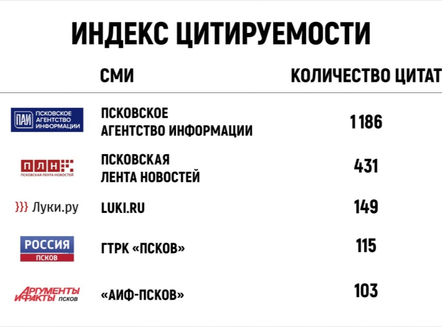 Лидером же с показателем 1 тыс. 186 цитат стало Псковское агентство информации. Отрыв от второго места рейтинга составил больше половины. «Серебро» забрала ПЛН (431 цитата).