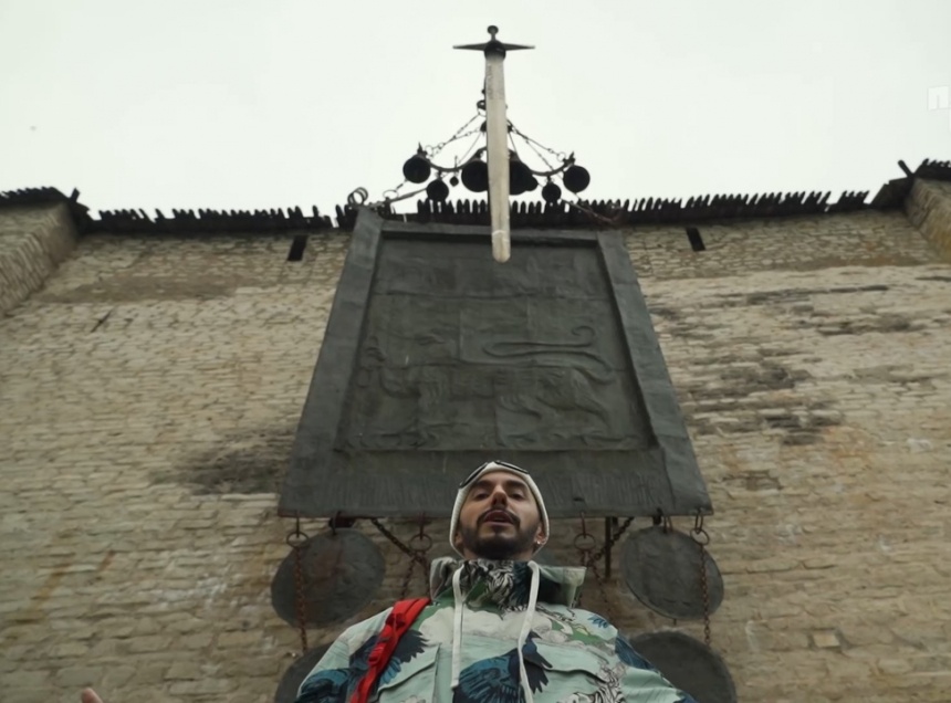 Также Тимур Родригез решил загадывать желание у меча Довмонта, но, как сообщил ведущий, это можно сделать только тогда, когда звенят и меч, и пластины.