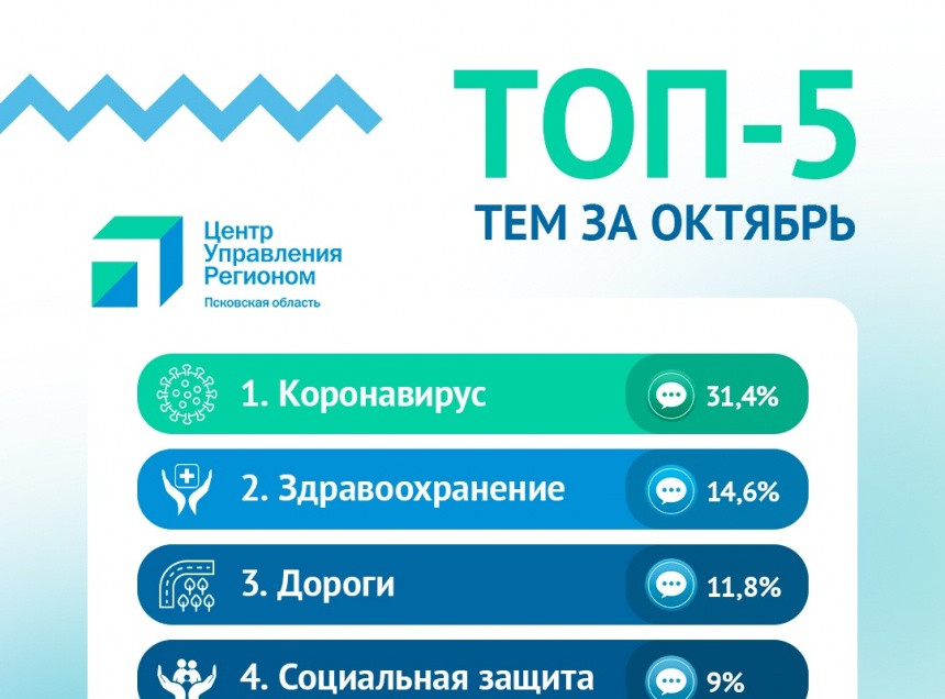 Согласно составленному рейтингу, лидером в октябре стал коронавирус. По этой теме было получено почти треть обращений, более 31% от их общего количества. На второй строчке рейтинга оказалась тема здравоохранения. По ней жители Псковской области отправили 14,6% поступивших обращений. Третье замыкающее место заняла дорожная тема. Вопросы по дорогам региона задавались в 11,8% обращениях.