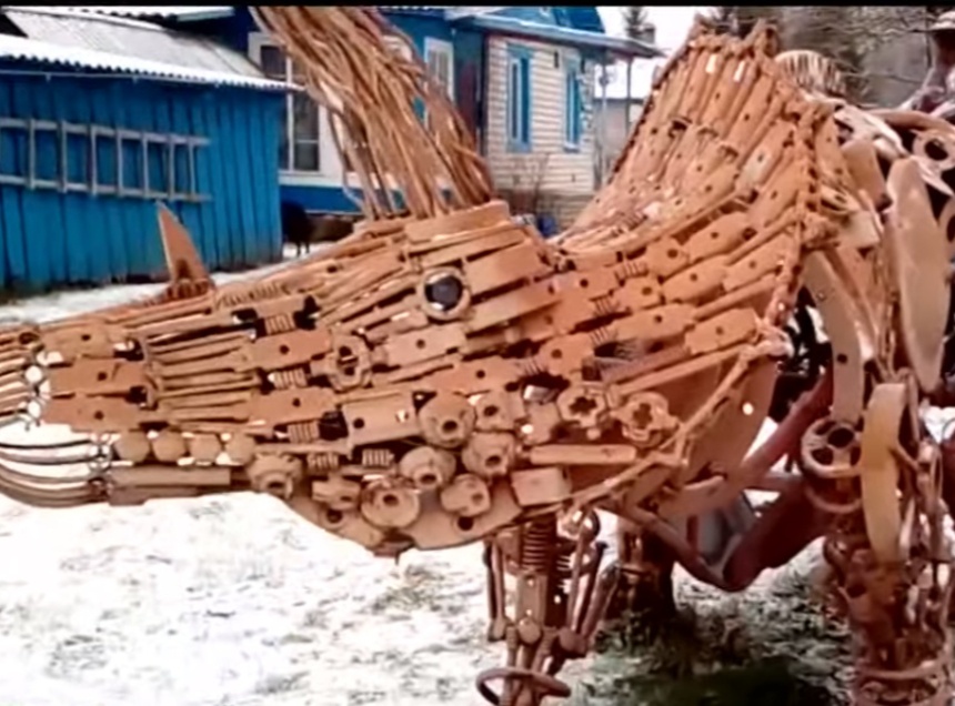 Скульптуру динозавра из автомобильных запчастей сконструировал сварщик-любитель из Опочки Роман Кириллов. Ранее данный арт-объект был включен в энциклопедию-путеводитель «100 самых необычных памятников России». Для нее создали специальную 3D-модель опочецкого динозавра из автохлама.