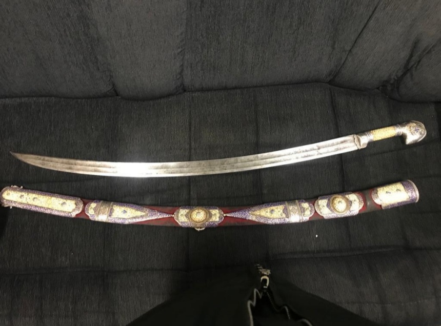 Предмет, напоминающий внешне саблю, уложенную в ножны, был обнаружен за водительским сиденьем транспортного средства в ходе проведения таможенного контроля.