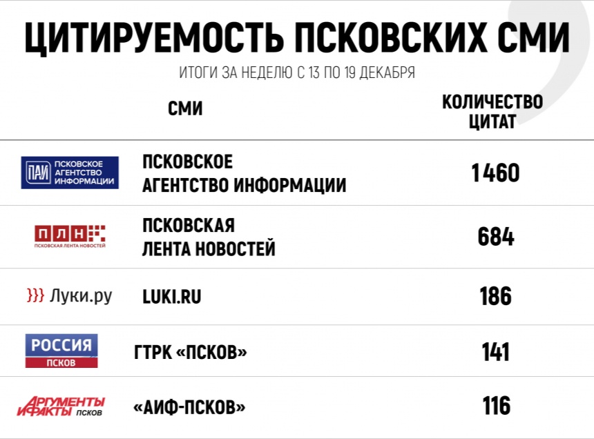 Лидером недели по количеству цитат в других СМИ вновь стало Псковское агентство информации. Его публикации упоминались 1 тыс. 460 раз. Второе место недельного рейтинга получила Псковская лента новостей с показателем 684 цитаты.
