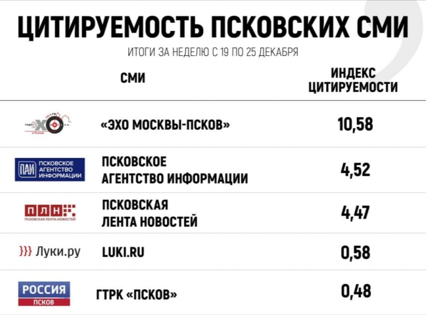 Лидером на неделе стало «Эхо Москвы Псков» с индексом цитируемости 10,58. Занять первое место радиостанции позволила прямая линия с губернатором Псковской области Михаилом Ведерниковым, которую цитировали федеральные СМИ.