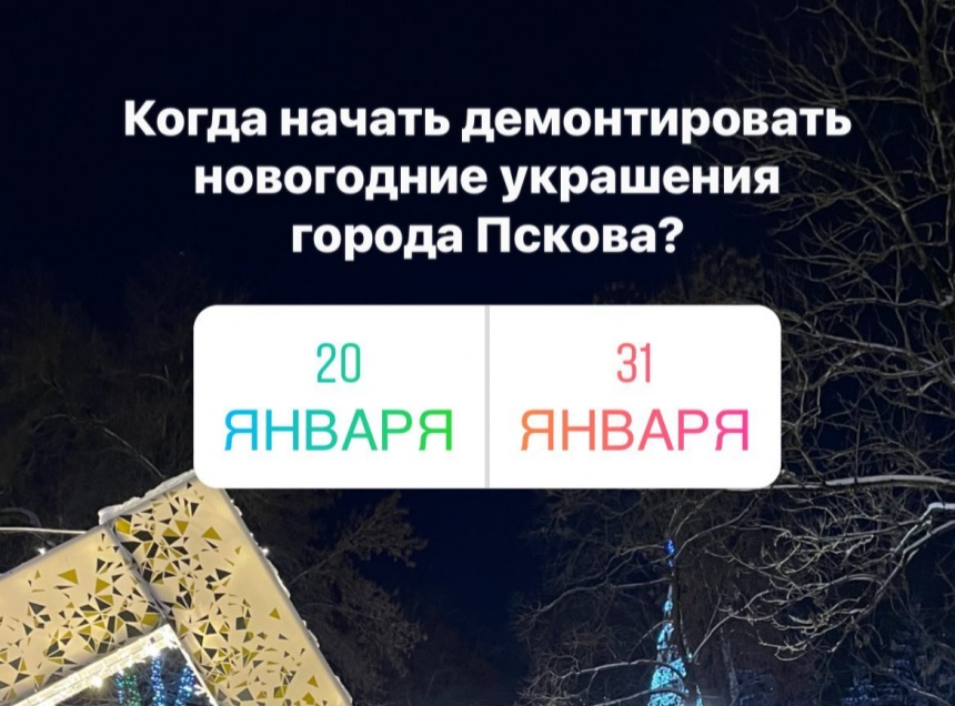 Глава администрации Пскова Борис Елкин предложил жителям Пскова выбрать день, в который будут демонтированы иллюминации, украсившие город в новогодние праздники. Соответствующий опрос он разместил в своем Instagram-аккаунте.