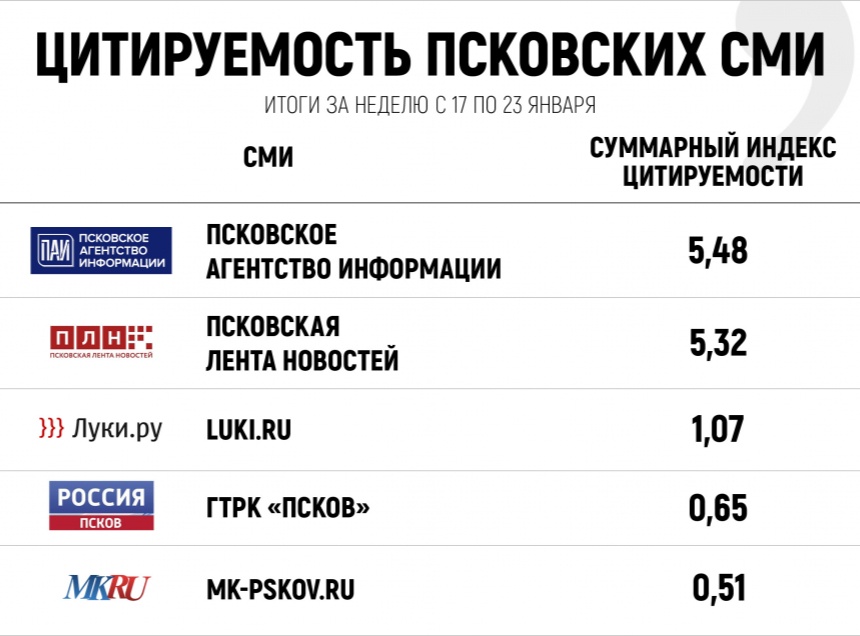В десятку самых цитируемых СМИ области вошли также работающие в одном холдинге с ПАИ газеты «АиФ-Псков» и «Комсомольская правда. Псков».