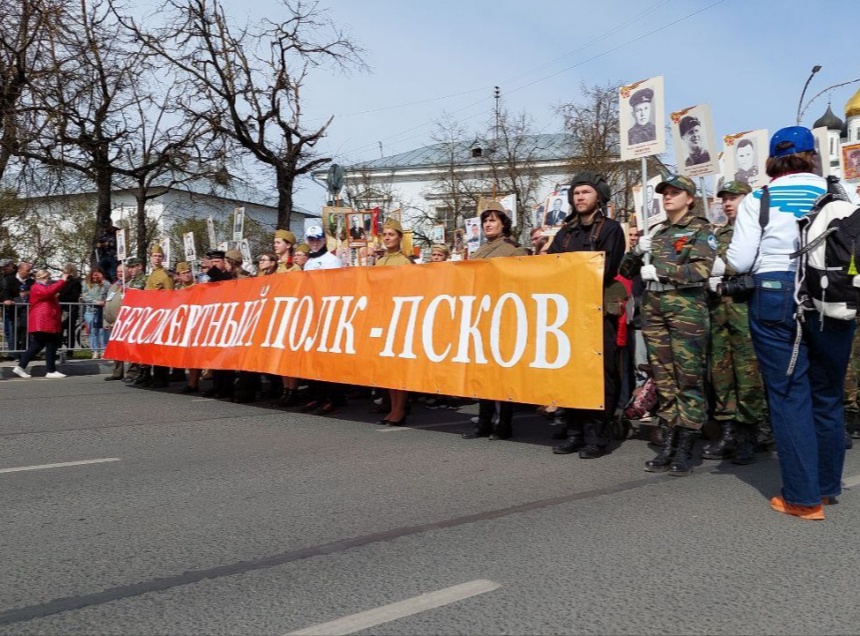 В шествии «Бессмертного полка» в Пскове принимают участие тысячи псковичей, которые пришли с портретами героев Великой Отечественной войны и участников специальной военной операции на территории Украины.