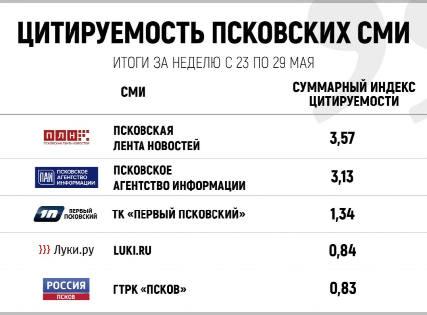 На первом месте недельного рейтинга расположилась ПЛН с индексом цитируемости 3,57, на второй строчке - Псковское агентство информации с ИЦ 3,13. На третьем месте в этот раз оказался телеканал «Первый Псковский», которому был присвоен индекс цитируемости 1,34.