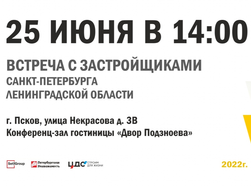 25 июня в 14:00 застройщики Санкт-Петербурга и Ленинградской области проведут встречу с жителями Пскова, расскажут о новостройках и о том, как выгодно купить квартиру в другом регионе. Мероприятие пройдет в конференц-зале гостиницы «Двор Подзноева» по адресу: улица Некрасова д. 3В. Для участия нужно зарегистрироваться по ссылке.