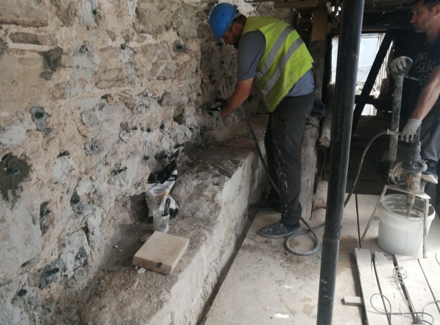 «На западном и южном фасадах известняк, превратившийся от времени в щебень, удаляли на глубину 50 см», – сообщили в организации и уточнили, что с помощью инъектирования специалисты укрепят историческую бутовую кладку.
