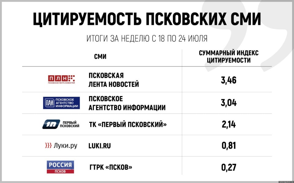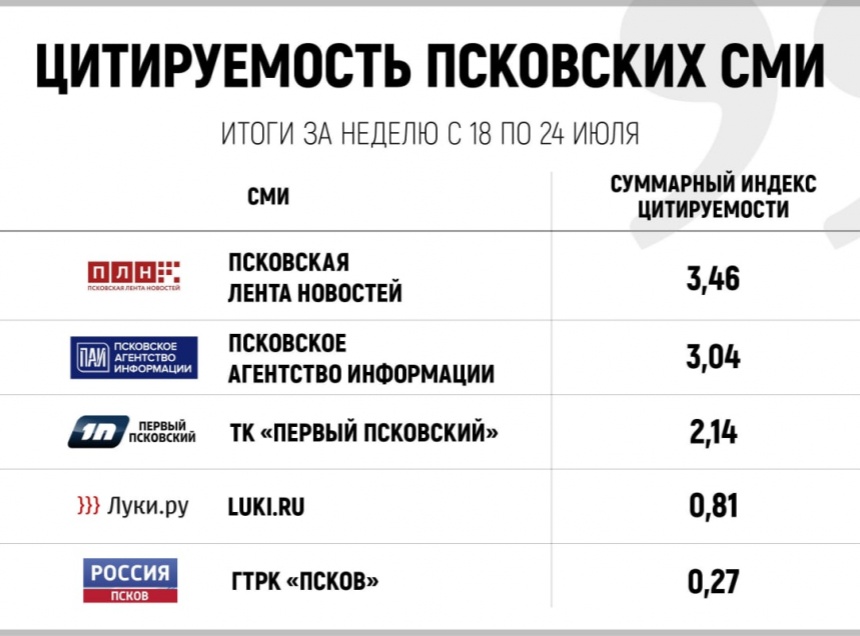 Названы самые цитируемые СМИ Псковской области по итогам прошедшей недели, с 18 по 24 июля. Рейтинг составили на основании данных сервиса «Медиалогия».