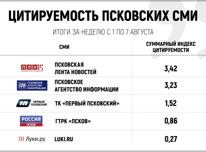 В рейтинге по количеству цитат среди всех СМИ Псковской области со значительным отрывом на первом месте оказалось Псковское агентство информации, на которое ссылались 34 раза. На втором месте расположилась местная лента новостей с 19 цитатами. Кроме того, в тройку вошел телеканал «Первый Псковский», материалы которого другие СМИ использовали 10 раз.