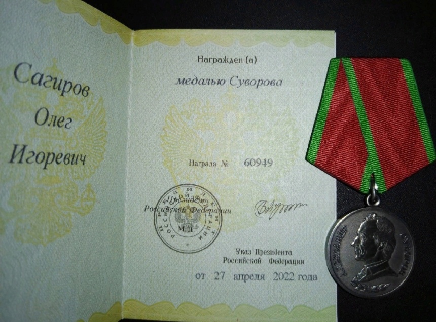 По словам военного комиссара, медалью Суворова Олега Сагирова наградили за отвагу, мужество и самоотверженность, проявленные при выполнении воинского долга. Иван Валуевич также отметил, что это первая в текущем году государственная награда, которую вручили в Пустошкинском районе участнику спецоперации.