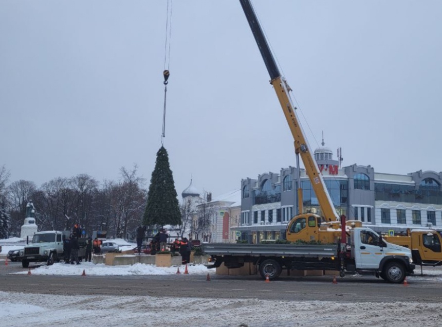 Монтаж главной новогодней ели идет в Пскове. Об этом передает корреспондент «Псковской правды».