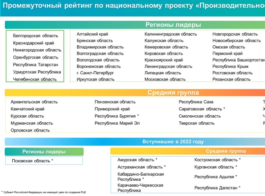 Среди 40 субъектов Российской Федерации, которые вступили в нацпроект «Производительность труда» больше одного года назад, лидерами промежуточного рейтинга за прошедший год стали Белгородская область, Краснодарский край, Нижегородская область, Оренбургская область, Республика Татарстан, Удмуртская Республика и Челябинская область.