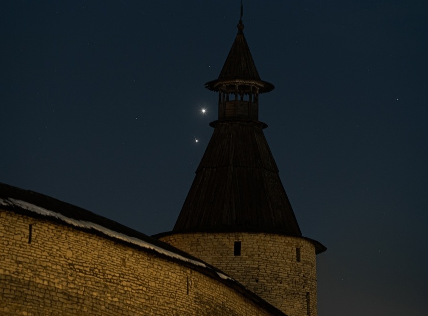 Астроном-любитель Петр Митрофанов сфотографировал соединение Юпитера и Венера над Псковом. Соответствующие снимки он опубликовал в группе «АстроПсков» в «ВКонтакте».