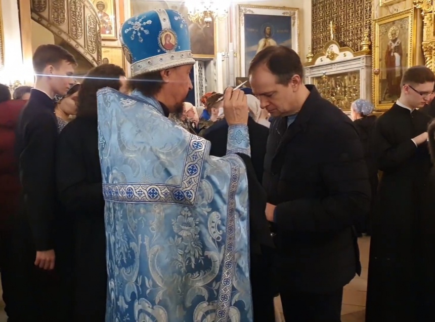 Во время поездки в Псково-Печерский монастырь Владимир Мединский принял участие во Всенощном бдении, которое состоялось накануне праздника – Благовещения Пресвятой Богородицы.