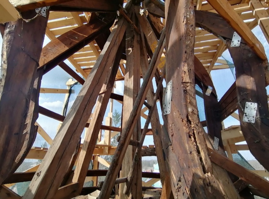 «Многие деревянные элементы не подлежат восстановлению», – подчеркнули в организации. Те элементы, которые возможно отреставрировать, будут протезироваться. В частности, специалисты выравнивают купол башни по центральной оси, угол наклона которого составляет 4 сантиметра.