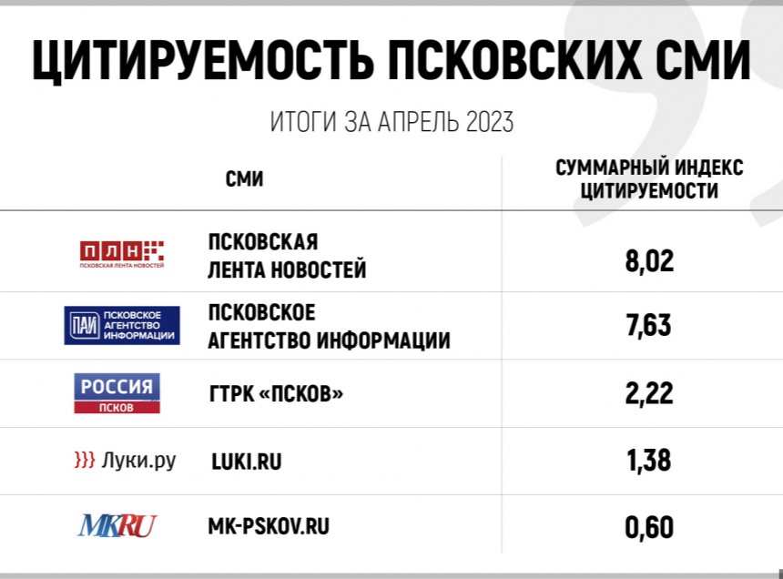 В апрельском рейтинге по цитируемости лидером стала местная лента новостей (ИЦ 8,02). Второе место заняло Псковское агентство информации (ИЦ 7,63). На третьей строчке расположилось ГТРК «Псков» (ИЦ 2,22). В ТОП-5 также вошли портал Luki.ru с индексом цитируемости 1,38 и региональный «Московский комсомолец» (ИЦ 0,6).