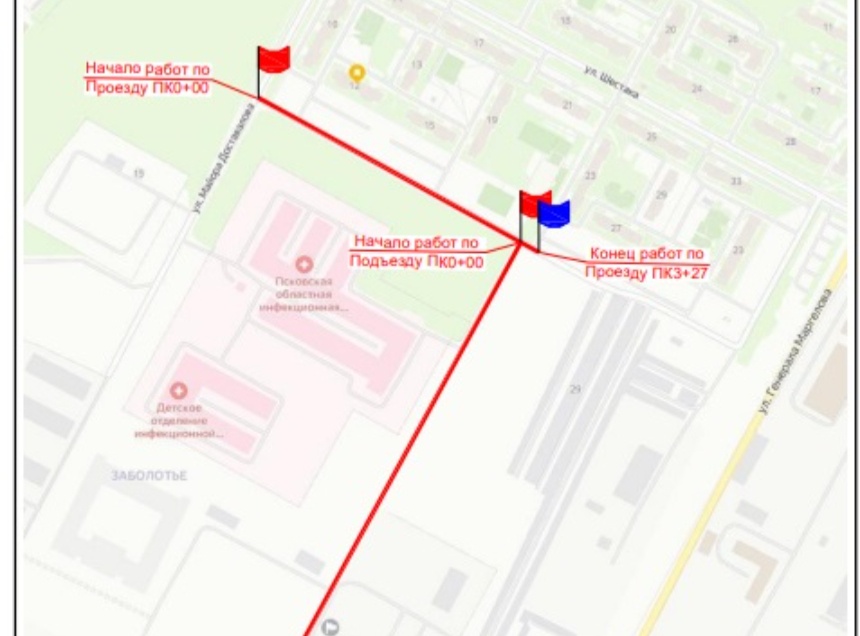 Согласно документации, строительство подъезда к медицинскому корпусу Псковского государственного университета будет вестись в пять этапов. Подрядная организация произведет устройство новых съездов и отремонтирует существующие, которые прилегают к близлежащим улицам. Также будет установлен бортовой камень.