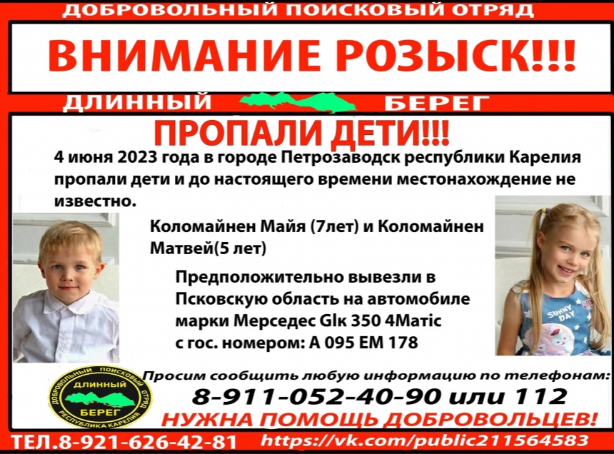 В поисковом отряде уточнили, что детей, предположительно, вывезли в Псковскую область на автомобиле Mercedes-Benz GLK 350 4-Matic (госномер А 095 ЕМ 178).