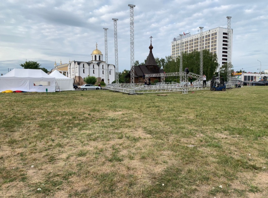Монтаж ведется на площади Тысячелетия Витебска. В настоящее время здесь уже установлен каркас главной сцены, на которой пройдут основные мероприятия.