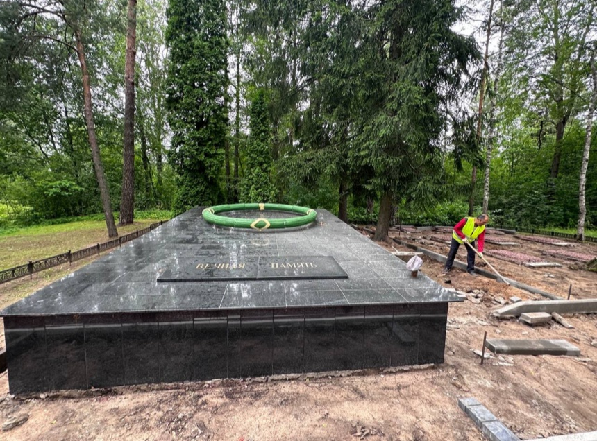 В ходе работ подрядчик установит бортовой камень и выполнит устройство покрытия из плитки. Разместят его вокруг памятника и самих захоронений.
