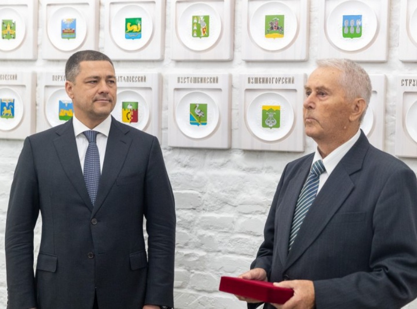 Нагрудные знаки к почетному званию «Заслуженный строитель Псковской области» были вручены директору предприятия «ЦентрСтрой» Алексею Майорову и ветерану строительной отрасти Леониду Старостенко.