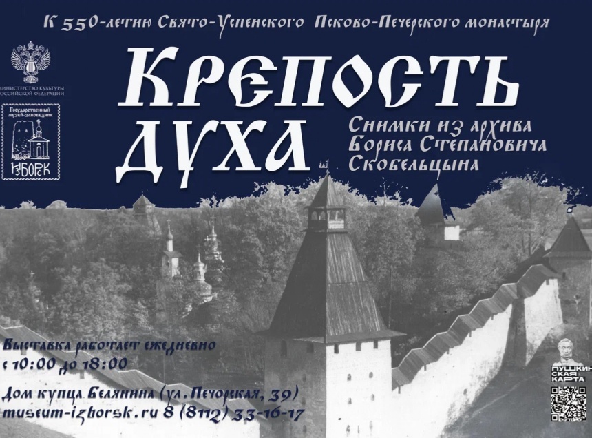 Выставка «Крепость духа» будет работать в усадьбе купца Белянина на улице Печорской, 39 с 10:00 до 18:00. Вход на выставку осуществляется по билетам в экспозицию «Изборская земля – святые места для Русской культуры».