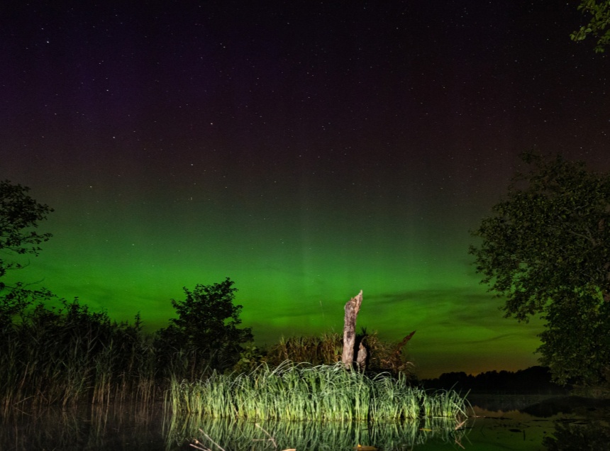 В эту же ночь другой астроном-любитель Михаил Прохоренко осуществлял съемку северного сияния под Псковом на фоне борщевиков и сосны.