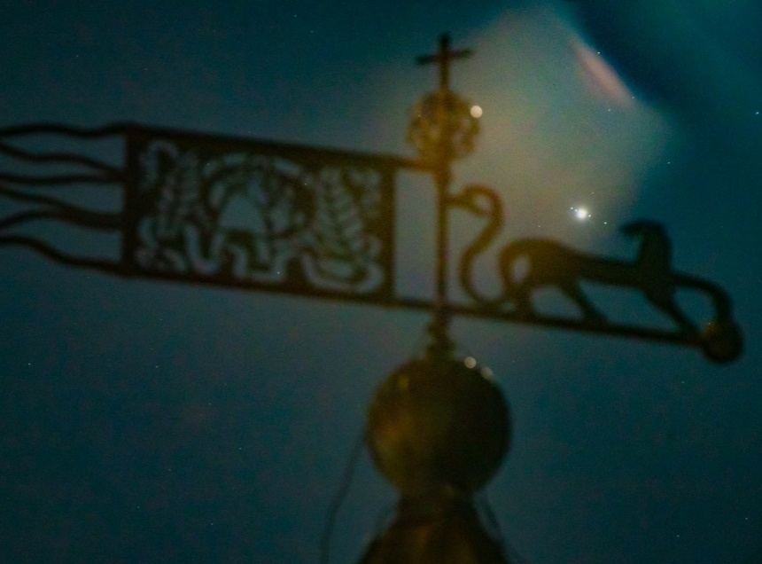 По его словам, съемка проходила в районе Покровской башни в Пскове. Запечатлеть Юпитер вместе с галилеевыми спутниками удалось над прапором башни с барсом.