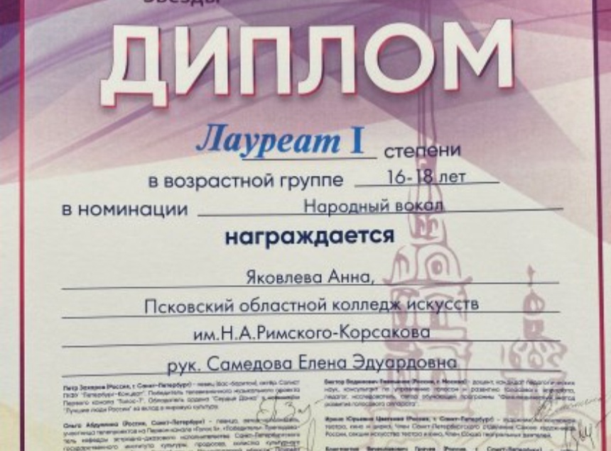 Лауреатом Международного конкурса-фестиваля «Старт звезды» стала студентка Псковского областного колледжа искусств имени Н. А. Римского-Корсакова Анна Яковлева. Об этом «Псковской правде» сообщили в пресс-службе правительства Псковской области.