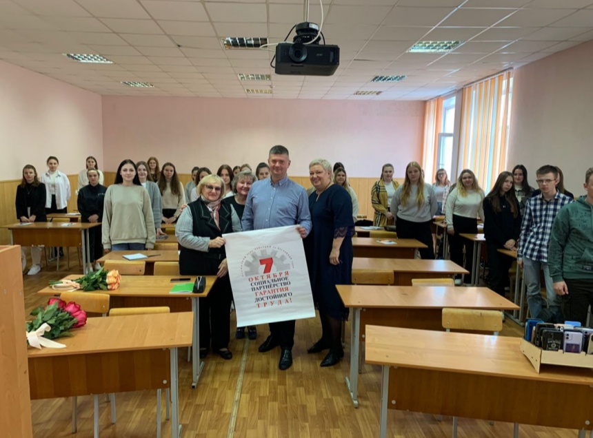 Лидер профсоюзного движения начал свое выступление с поздравления педагогического состава техникума с Днем учителя, рассказал о социальном партнерстве и работе профсоюзов в этом направлении.