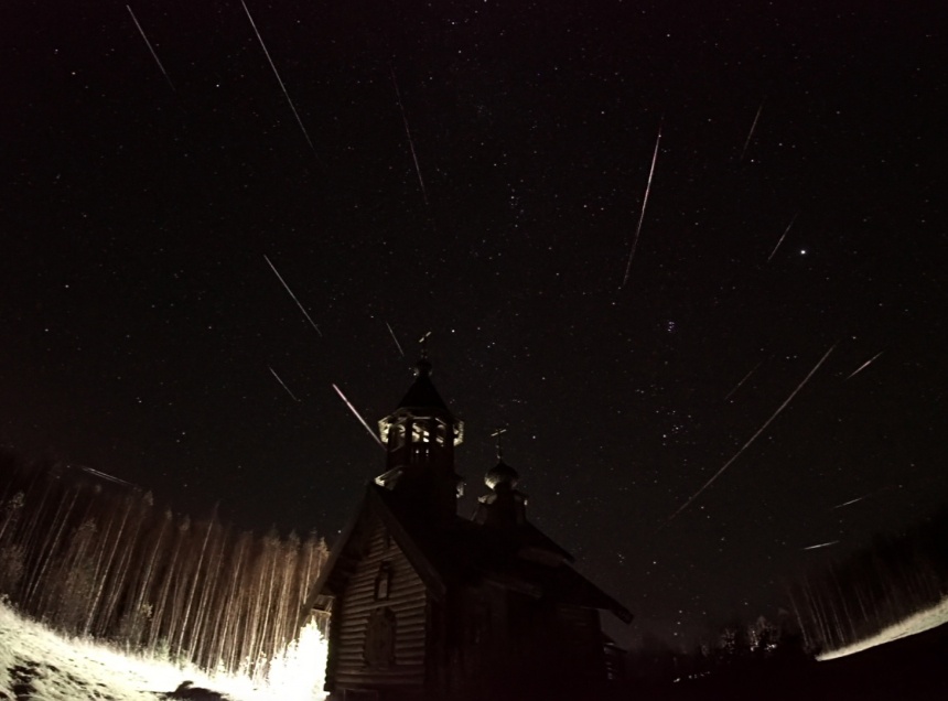 По его словам, съемки проводились в ночь на 22 октября. Запечатлеть метеоры потока Ориониды Петру Митрофанову удалось над храмом Василия в деревне Акулова Гора Лодейнопольского района Ленинградской области.
